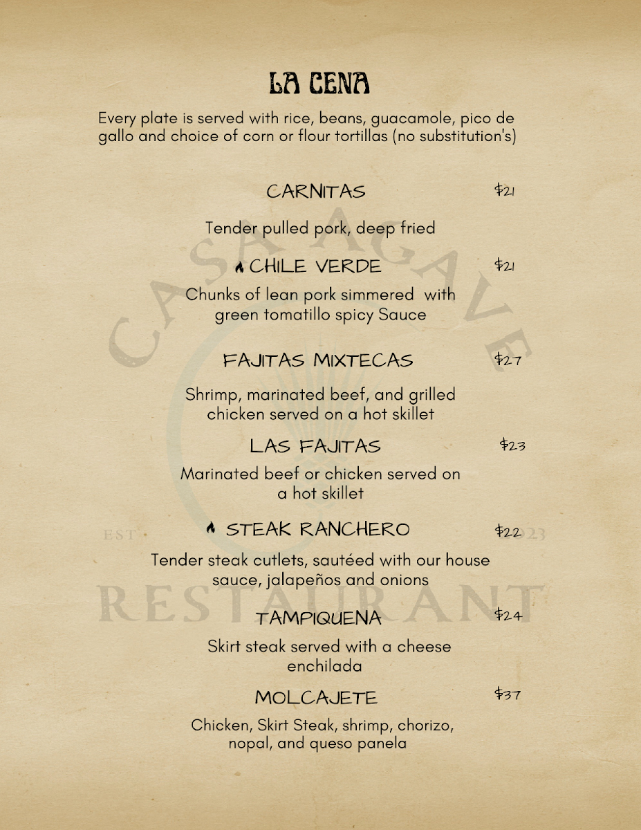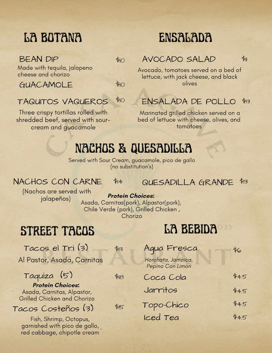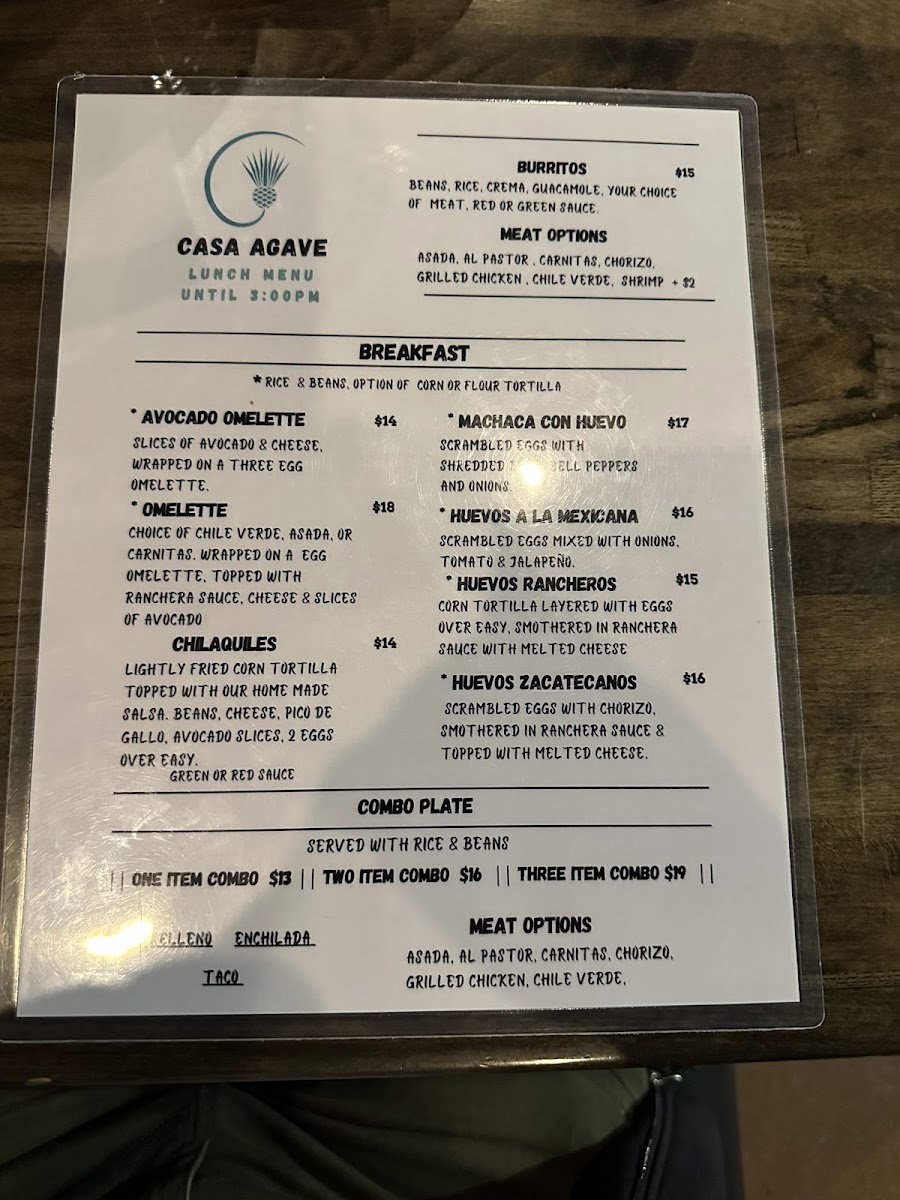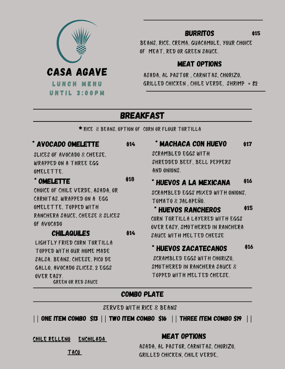 Casa Agave Restaurant offers a menu that blends classic Mexican flavors with casual, inviting dining. The selection ranges from comforting favorites like enchiladas and street-style tacos to fresh, vibrant salads and hearty burritos. Whether you're settling in for a relaxed lunch or unwinding with friends over cocktails, the menu pairs well with the warm, friendly atmosphere of the space.