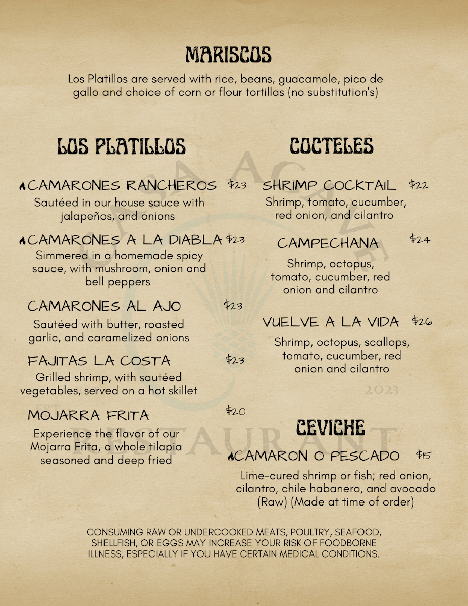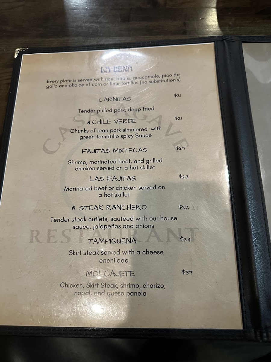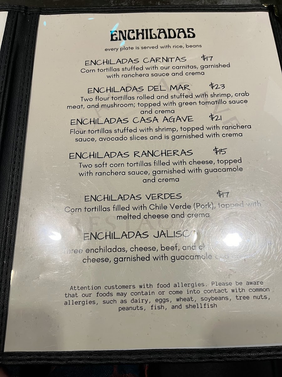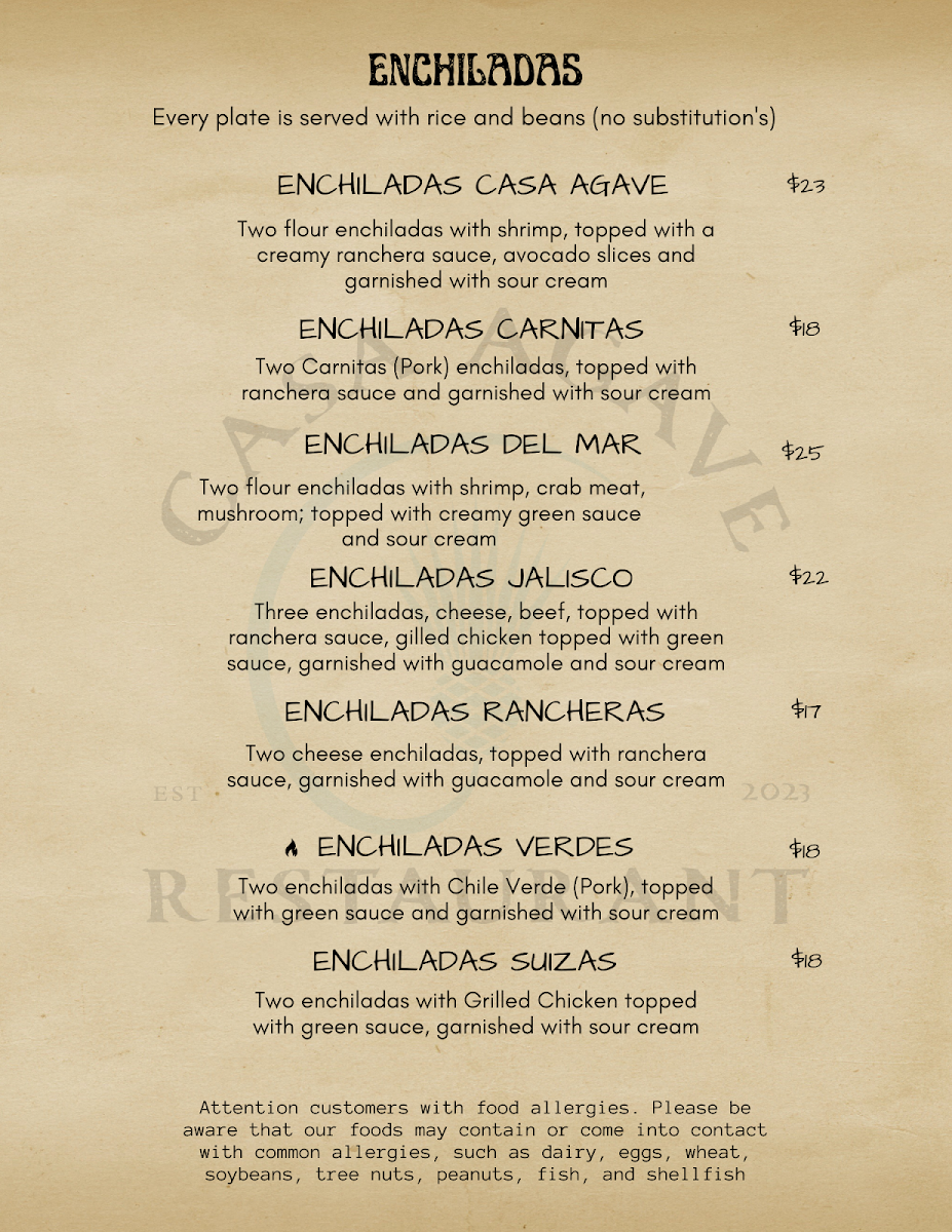 Casa Agave Restaurant offers a menu that blends classic Mexican flavors with casual, inviting dining. The selection ranges from comforting favorites like enchiladas and street-style tacos to fresh, vibrant salads and hearty burritos. Whether you're settling in for a relaxed lunch or unwinding with friends over cocktails, the menu pairs well with the warm, friendly atmosphere of the space.